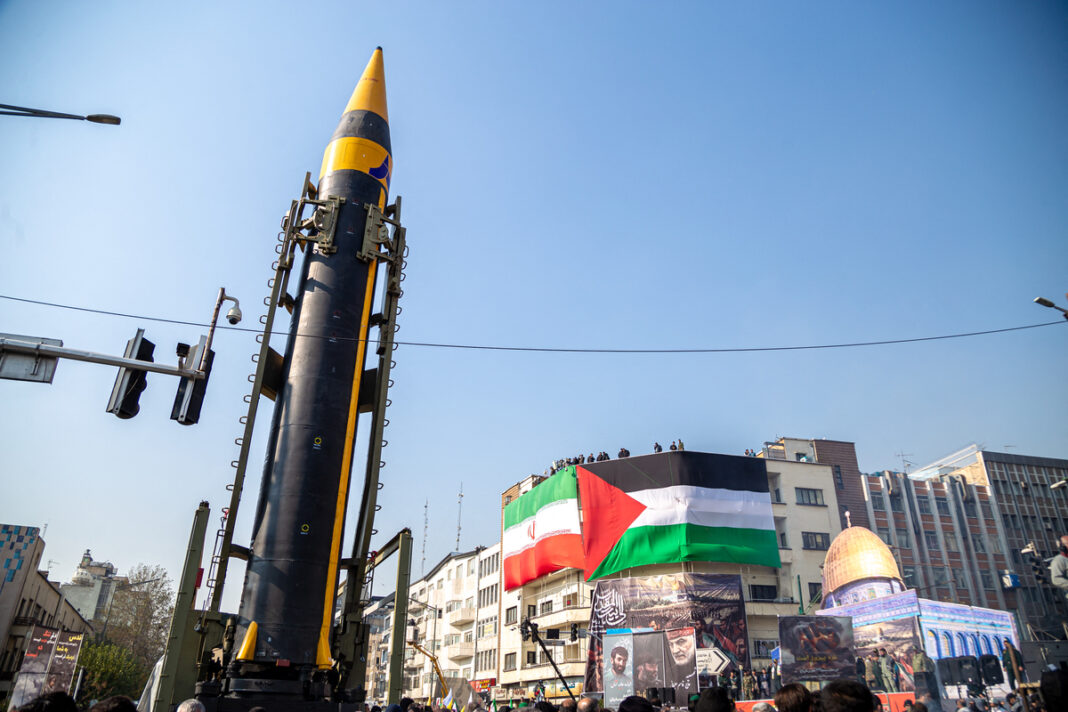 11/24/2023 Tehran, Iran. Protesters and members of Iranian paramilitary's Basij forces march next to the fourth generation Khorramshahr ballistic missile Khaibar displayed during an anti-Israeli rally to show their solidarity with Palestinians, in Tehran on November 24, 2023. (Photo by Hossein Beris / Middle East Images via AFP)