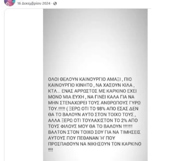 Το μήνυμα το οποίο είχε αφήσει η ίδια η Κατερίνα, στο προφίλ της στο facebook στις 16 Δεκεμβρίου 2024 συγκλονίζει ακόμα εκείνους που την γνώριζαν… «Όλοι θέλουν καινούργιο αμάξι, πιο καινούργιο κινητό, να χάσουν κιλά, κτλ… Ένας άρρωστος με καρκίνο έχει μόνο μία ευχή, να γίνει καλά για να μην στενοχωρεί τους ανθρώπους γύρω του!!! (Ξέρω ότι το 98% από εσάς δεν θα το βάλουν αυτό στον τοίχο τους, αλλά ξέρω ότι τουλάχιστον το 2% από τους φίλους μου θα το βάλουν!!!! Βάλτο στον τοίχο σου για να τιμήσεις αυτούς που πέθαναν ή που προσπαθούν να νικήσουν τον καρκίνο!!!»… ήταν το μήνυμα της Κατερίνας.