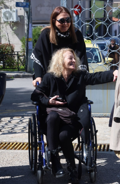 Σε αναπηρικό καροτσάκι εμφανίστηκε η ηθοποιός Λουκία Πιστιόλα στην κηδεία του Γιώργου Πανουσόπουλου.