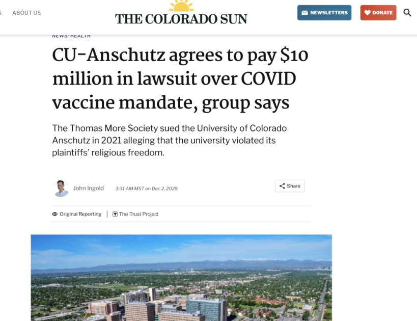 Ο συμβιβασμός προκύπτει από μια αγωγή του 2021, Does 1–11 εναντίον University of Colorado, η οποία ισχυρίστηκε ότι το πανεπιστήμιο παραβίασε την Πρώτη Τροπολογία-First Amendment αρνούμενο την θρησκευτική εξαίρεση από την απαίτηση εμβολιασμού κατά της COVID-19, αναγκάζοντας άτομα με ειλικρινείς θρησκευτικές αντιρρήσεις να απολυθούν ή να αποσυρθούν.