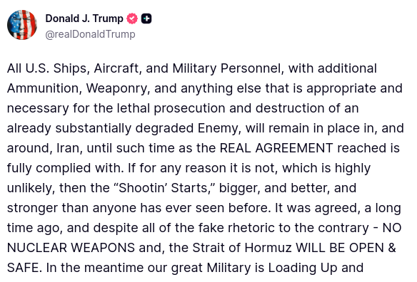 Η αβεβαιότητα εντείνεται και από την πρωινή ανάρτηση του Ντόναλντ Τραμπ (07:00, ώρα Ελλάδας) που έγραψε στο truth social ότι οι αμερικανικές δυνάμεις παραμένουν σε θέση μάχης στην περιοχή.