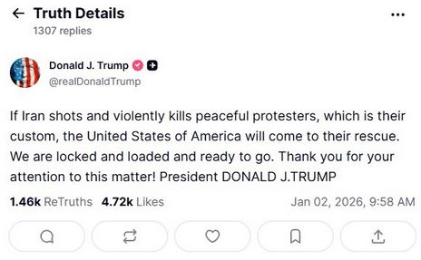 «Αν το Ιράν πυροβολήσει και δολοφονήσει βάναυσα ειρηνικούς διαδηλωτές, όπως κάνει συνήθως, οι Ηνωμένες Πολιτείες της Αμερικής θα σπεύσουν σε βοήθειά τους.