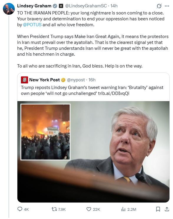 Trump reposts Lindsey Graham’s tweet warning Iran: ‘Brutality’ against own people ‘will not go unchallenged’ https://t.co/Q1ZWwMZBff pic.twitter.com/0yT356eeVP