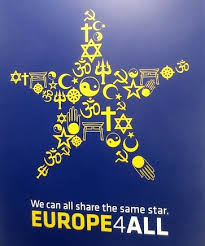 ΚΟ: Περί «αντικομμμουνιστικής ΕΕ»: Η παραπάνω είναι «εορταστική» αφίσα της ΕΕ. «Η Ευρώπη για όλους» κλπ. Σε περίοπτη θέση το σφυροδρέπανο. Εάν προσέξετε, θα διαπιστώστε καταρχάς, ότι όλα τα υπόλοιπα σύμβολα – εκτός του σφυροδρέπανου – είναι σύμβολα θρησκειών! Φαίνεται ότι ο άνθρωπος που σχεδίασε το multi faith ΕΕ αστέρι, θεωρεί το σφυροδρέπανο ένα θρησκευτικό σύμβολο! Επίσης ο σταυρός δεν βρίσκεται στο κέντρο του αστεριού, αλλά σε πιο υποβαθμισμένες θέσεις. Τέσσερις φορές εμφανίζεται το σφυροδρέπανο και τέσσερις το αστέρι του Δαβίδ (οποία σύμπτωσις). Λιγότερες δηλαδή, από όσες (3) εμφανίζεται ο σταυρός!… Πηγή