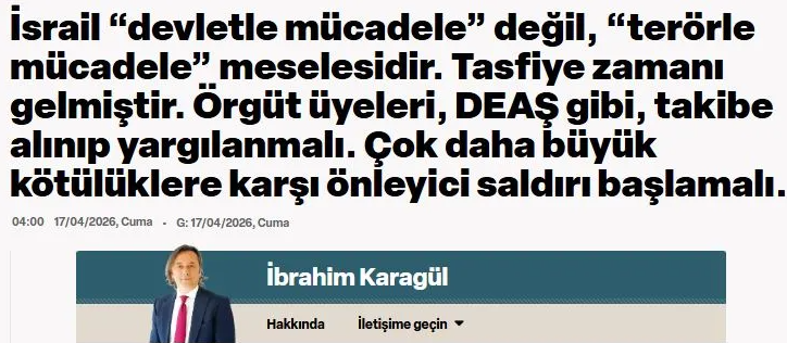 «Το Ισραήλ δεν είναι θέμα «καταπολέμησης του κράτους», αλλά «καταπολέμησης της τρομοκρατίας». Ήρθε η ώρα της εξάλειψής του. Τα μέλη της οργάνωσης, όπως του ISIS, θα πρέπει να εντοπιστούν και να διωχθούν. Μια προληπτική επίθεση πρέπει να ξεκινήσει ενάντια σε πολύ μεγαλύτερα δεινά», γράφει ο Τούρκος αρθρογράφος Ιμπραήμ Καραγκιούλ στη Yeni Şafak.