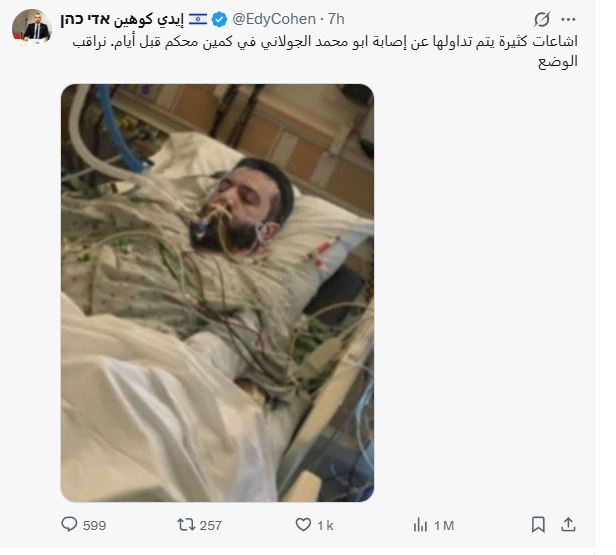 Γράφει σε ανάρτηση του στο twitter σήμερα ο Edy Cohen Eβραίος δημοσιογράφος με λιβανέζικη υπηκοότητα Πολιτικός Επιστήμονας, ειδήμονας στο Μεσανατολικό με 1.000.0000 ακολούθους ”Κυκλοφορούν πολυάριθμες φήμες ότι ο Αμπού Μοχάμεντ αλ-Τζουλάνι τραυματίστηκε σε μια προσεκτικά σχεδιασμένη ενέδρα πριν από λίγες ημέρες. Παρακολουθούμε στενά την κατάσταση.”