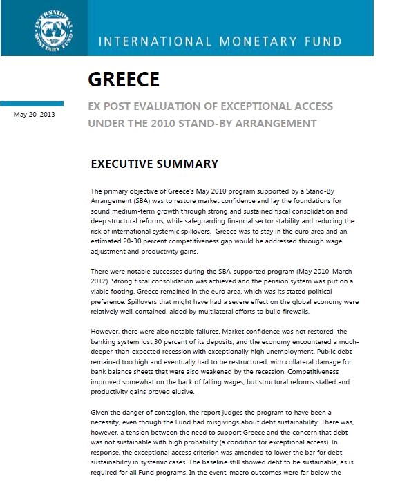 Το ταμείο παραδέχεται, επίσης, ότι υποτίμησε τις αρνητικές συνέπειες της λιτότητας και δεν έκρινε σωστά την ικανότητα της ελληνικής κυβέρνησης να παραδώσει γρήγορα διαρθρωτικές μεταρρυθμίσεις