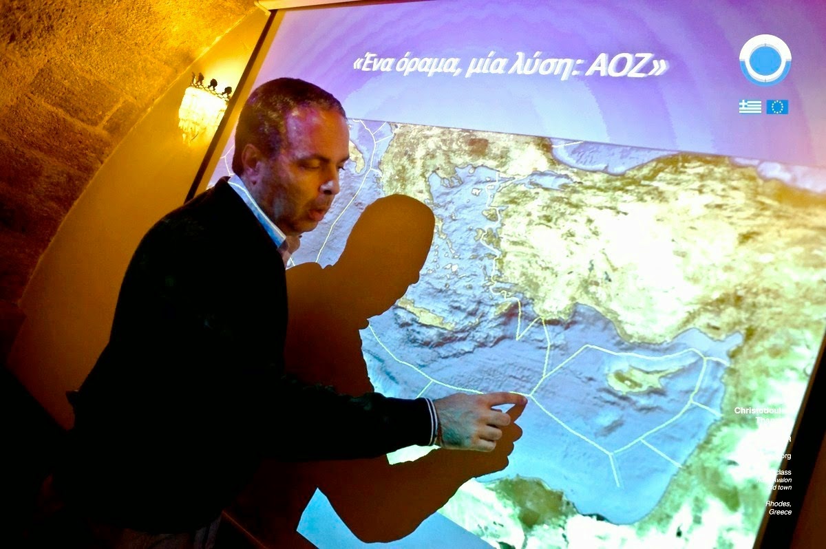 Ας δούμε όμως τι σημαίνει αυτό στην πράξη. Στη διπλανή φωτογραφία βλέπουμε τον στρατηγικό αναλυτή και έναν από τους συμβούλους της Ελλάδας στο θέμα της ΑΟΖ Δρα Λυγερό Νικόλαο, να δείχνει το τριπλό σημείο επαφής των ΑΟΖ Ελλάδος, Κύπρου και Αιγύπτου. Το εγχείρημα δεν είναι εύκολο πλην όμως είναι πολύ σημαντικό και εντάσσεται στον μακροχρόνιο σχεδιασμό της οριοθέτησης της ΑΟΖ με τις γειτονικές μας χώρες.