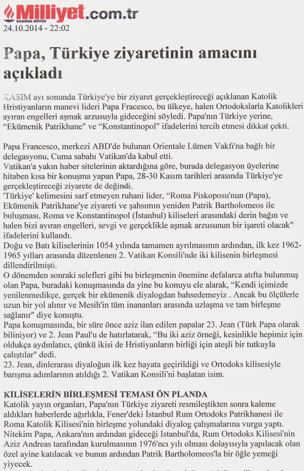 Η τουρκική εφημερίδα επικαλείται την επίσημη ιστοσελίδα του Βατικανού η οποία σχολιάζοντας πρόσφατη συνάντηση του Πάπα με μια αντιπροσωπεία του Παπικού Κέντρου των Ηνωμένων Πολιτειών, Oriental Lümen Vakfı, αναφέρει ότι ο Ποντίφικας έκανε δήλωση για προσεχή επίσκεψη του στην Τουρκία και την συνάντηση του με τον Πατριάρχη Βαρθολομαίο. Στην δήλωση αυτή ο Πάπας τόνισε ότι θα γίνει το μεγάλο και πολύ σημαντικό βήμα για την άρση και των τελευταίων εμποδίων για την ένωση των «εκκλησιών», η οποία άρχισε το 1054 με τα γνωστά τότε ιστορικά γεγονότα και τα ανάθεμα μεταξύ των δυο Πατριαρχείων, της Ρώμης και της Κωνσταντινούπολης. Όπως αναφέρεται, η συνάντηση αυτή είναι συνέχεια μιας μεγάλης προσπάθειας που άρχισε από το 1962 και κορυφώθηκε πριν από λίγο καιρό με την συμπροσευχή των δυο θρησκευτικών ηγετών στα Ιεροσόλυμα, στις 25 Μαΐου, συμπροσευχή που θεωρείται από το Βατικανό σταθμός στην πορεία της ένωσης των «εκκλησιών».