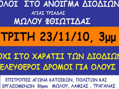 Συγκέντρωση διαμαρτυρίας θα πραγματοποιήσουν σήμερα τα μέλη των επιτροπών αγώνα στα διόδια της Αγίας Τριάδας, στο Μώλο Φθιώτιδας.Κάτοικοι και φορείς θα ανοίξουν τις μπάρες, ώστε οι οδηγοί να διέρχονται ελεύθερα.