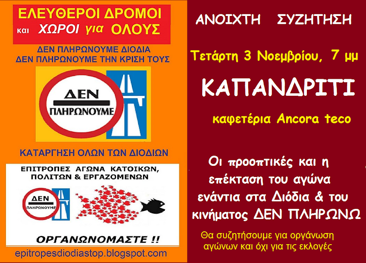 Το Πανελλαδικό Συντονιστικό κατά των διοδίων θα γίνει, αφού σωπάσουν οι Σειρήνες του Καλλικράτη,έτσι ώστε κανένας να μην εκμεταλλευτεί το κίνημά μας για μικροπολιτικούς εκλογικούς σκοπούς αλλά και για να υπάρξει η κατάλληλη προετοιμασία για μια πανελλαδική συνάντηση από τα κάτω και όχι από τα πάνω, με την συμμετοχή κάποιων δήθεν “εκπροσώπων” του κινήματος.