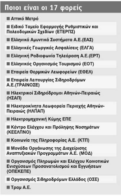Στην κλίνη του Προκρούστη τοποθετεί η τρόικα 17 ΔΕΚΟ και φορείς του δημόσιου τομέα, μεταξύ των οποίων η ΕΡΤ, ο ΕΟΤ, το μετρό, το τραμ, οι σιδηρόδρομοι, οι αστικές συγκοινωνίες, οι αμυντικές βιομηχανίες, ακόμη και φορείς που παρέχουν εξειδικευμένες υπηρεσίες στο Δημόσιο, όπως η ΜΟΔ και η ΚτΠ Α.Ε.