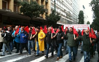 Την οδό Σταδίου ανεβαίνει αυτή την ώρα η πορεία του ΠΑΜΕ ενάντια στα μέτρα της κυβέρνησης. Οι χιλιάδες διαδηλωτές που κατέβηκαν στο κέντρο της Αθήνας και έδωσαν το «παρών» στο συλλαλητήριο της Ομόνοιας, κατευθύνονται προς την πλατεία Συντάγματος με τελικό προορισμό τη Βουλή. Κρατούν σημαίες και πανό και φωνάζουν συνθήματα όπως «την κρίση να πληρώσει η πλουτοκρατία».
