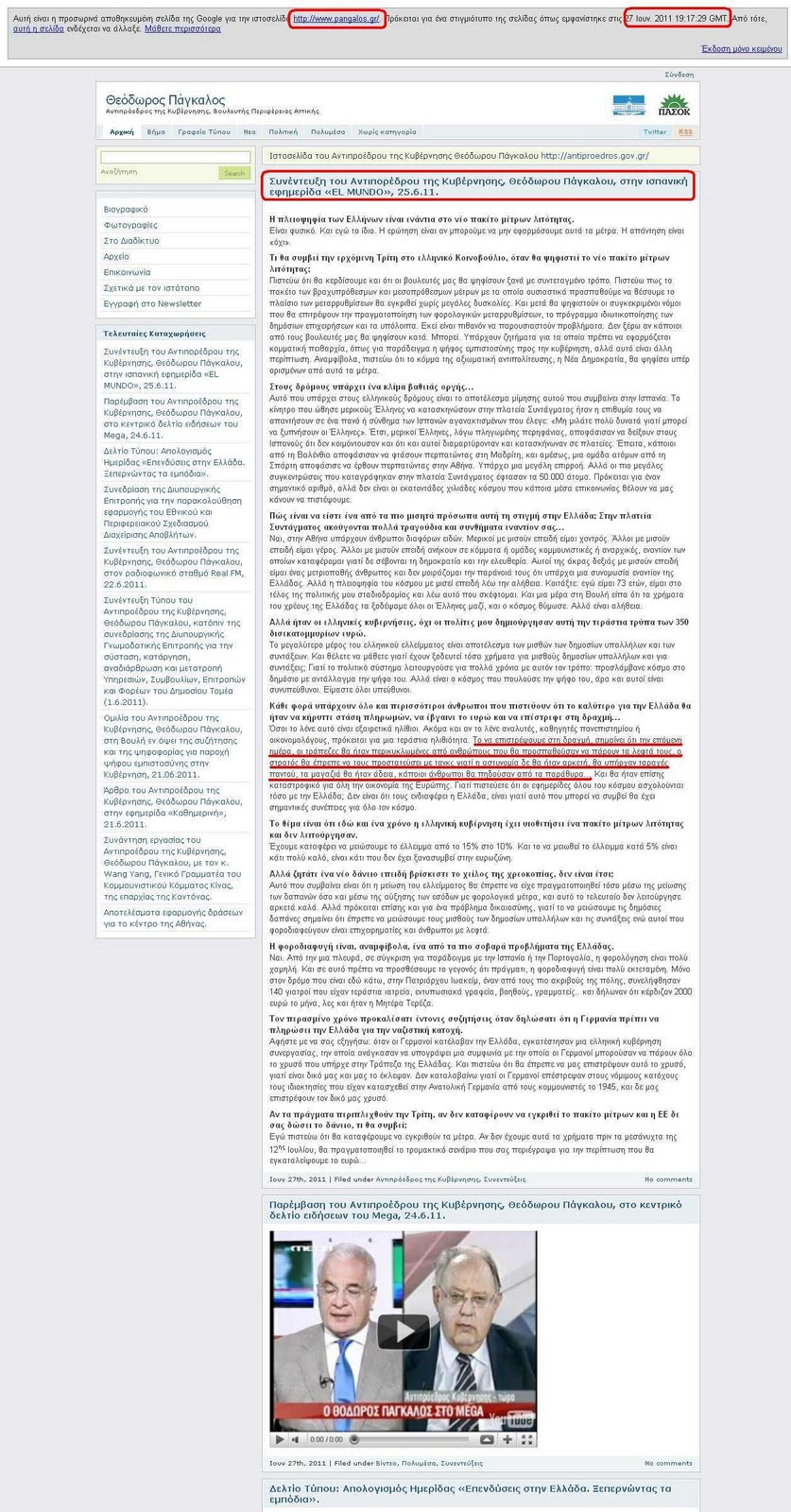 Κι όμως! Χθες το βράδυ η σελίδα του Πάγκαλου είχε την συνέντευξή του χωρίς να αναφέρει αυτά που είπε στη Βουλή ότι δήθεν αναφέρονταν στην Αργεντινή!! Δείτε κάνοντας κλικ στη εικόνα αριστερά πως ήταν η σελίδα του χθες, όπως έχει αποθηκευτεί και μπορείτε να τη δείτε τις επόμενες ώρες και στη μνήμη της Google.