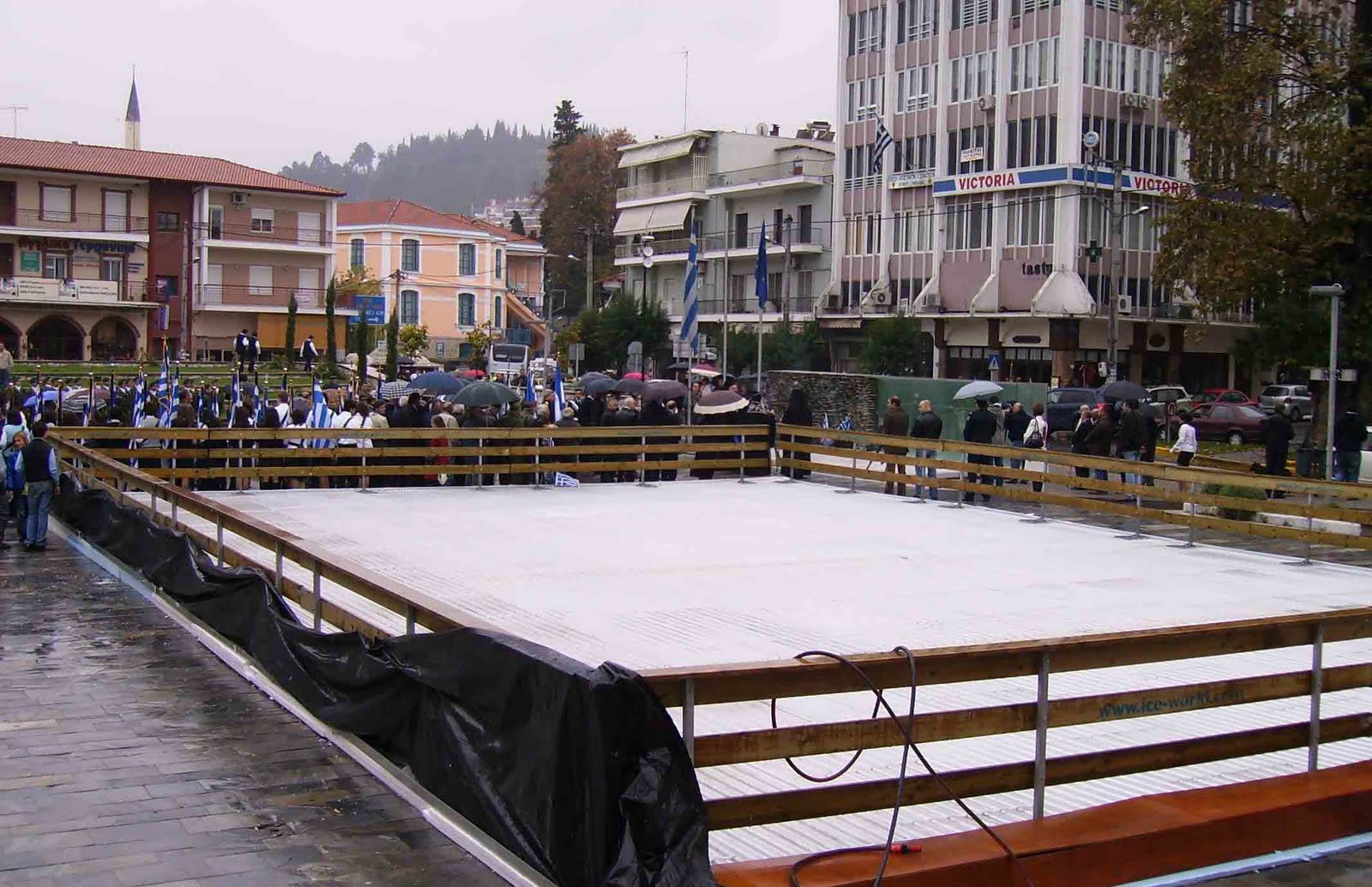 Στην πλατεία ωρολογίου, γινόταν πάντα οι εκδηλώσεις μνήμης των επετείων. Καταθέσεις στεφάνων, κλπ. Εφέτος, η Δήμαρχος, νοίκιασε την μισή πλατεία σε ιδιώτες για παγοδρόμιο. Το παγοδρόμιο, στήθηκε στις 27 Οκτωβρίου.