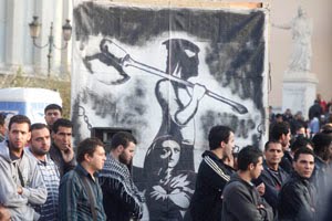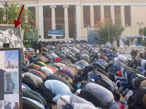 Φωτογραφίες από τη χθεσινή προσευχή των μουσουλμάνων της Αθήνας, στην Ακαδημία. Αυτό το πανό με τον τύπο που κρατάει το τσεκούρι, τι συμβολίζει, μέσα στον κόσμο που προσεύχεται;