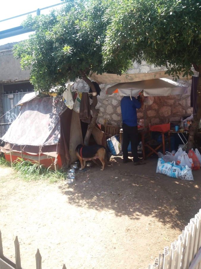 Ξαναλεω οτι ζει εκει σε μια σκηνη οπως θα δειτε ενα περιφραγμενο οπως μπορει χωρο μικρο,μαζι με την λιζα την σκυλιτσα του,η οποια χρειαζεται στειρωση,και τα 8 κουταβια της,μολις ημερων.σημερα ειδα ειχαν ανοιξει και τα ματια τους.