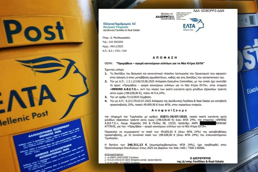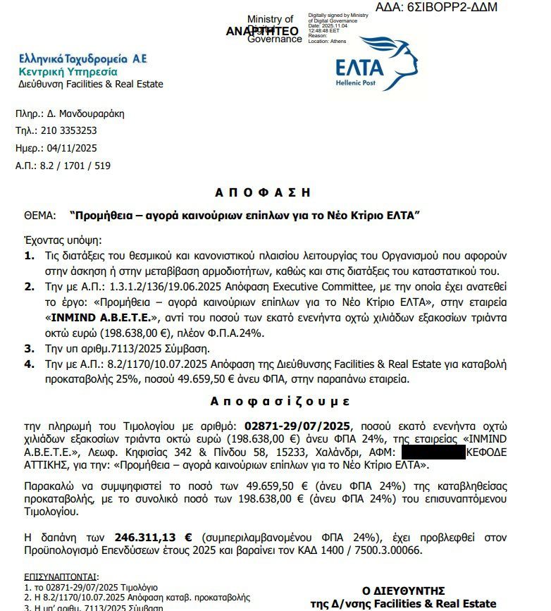 Όπως φαίνεται σε έγγραφο το οποίο αναρτήθηκε στη Διαύγεια, στις 4 Νοεμβρίου 2025 αποφασίστηκε η πληρωμή τιμολογίου 198.638 ευρώ, άνευ ΦΠΑ 24%, της εταιρείας Inmind ABETE για την προμήθεια – αγορά καινούργιων επίπλων για το νέο κτίριο των ΕΛΤΑ. Η συνολική δαπάνη για τα έπιπλα έφτασε τις 246.311,13 ευρώ (συμπεριλαμβανομένου ΦΠΑ 24%) και σύμφωνα με τα ΕΛΤΑ έχει προβλεφθεί στον προϋπολογισμό επενδύσεων του έτους 2025.