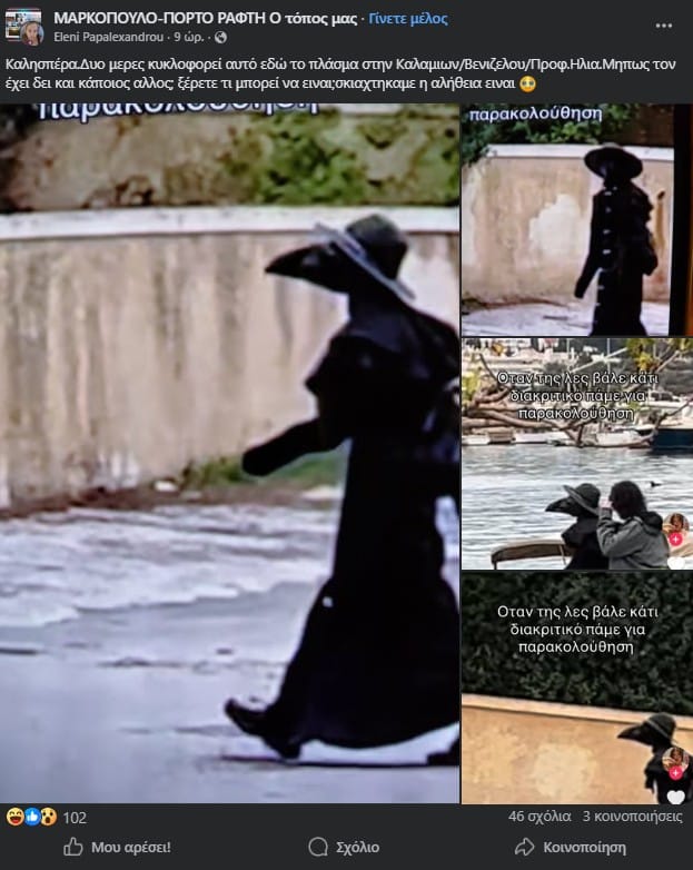 Αυτόπτες μάρτυρες και κάτοικοι της περιοχής αναφέρουν ότι εδώ και δύο ημέρες ένα μυστηριώδες άτομο, του οποίου το φύλο παραμένει άγνωστο, κινείται σε διάφορα σημεία του Πόρτο Ράφτη φορώντας μια ενιαία μαύρη στολή που καλύπτει ολόκληρο το σώμα του. Το πρόσωπο είναι επίσης καλυμμένο από έναν σκοτεινό μανδύα, ενώ το πιο εντυπωσιακό και συνάμα ανατριχιαστικό στοιχείο της εμφάνισής του είναι ένα μακρύ, προεξέχον ράμφος που θυμίζει έντονα τις στολές των «γιατρών της πανούκλας» του Μεσαίωνα.