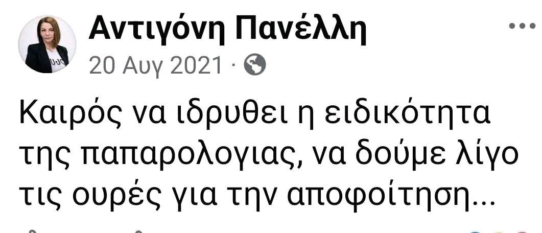 «Η Αντιγόνη Πανέλλη γεννήθηκε στην Πρέβεζα το 1969 και μεγάλωσε στην Κορωνησία. Μετά την ολοκλήρωση των σπουδών της, ξεκίνησε την επαγγελματική πορεία της στην εφημερίδα ”ΕΛΕΥΘΕΡΟΣ”, καλύπτοντας το ρεπορτάζ των υπουργείων Μεταφορών-Επικοινωνιών και ΥΠΕΧΩΔΕ. Στη συνέχεια εργάστηκε στην εφημερίδα «ΒΡΑΔΥΝΗ», ενώ αργότερα μεταπήδησε στο κοινοβουλευτικό ρεπορτάζ, στο οποίο διακρίθηκε. Ακολούθως εντάχθηκε στο Αθηναϊκό Πρακτορείο Ειδήσεων και στην ιστοσελίδα cnn, όπου παρέμεινε έως και σήμερα», αναφέρει η ΕΣΗΕΑ.