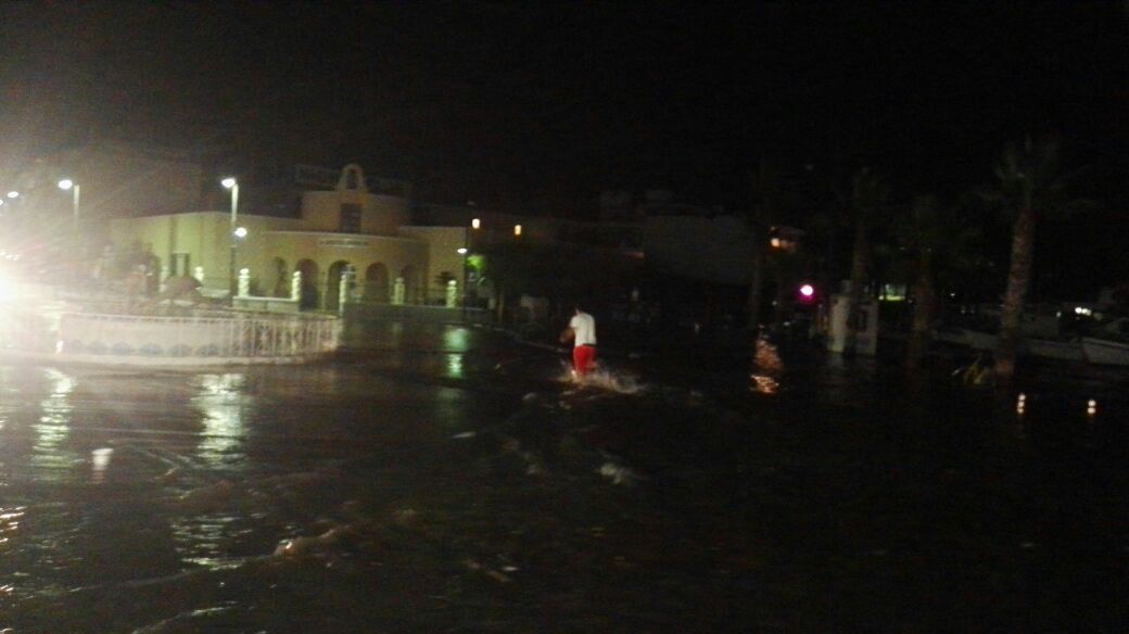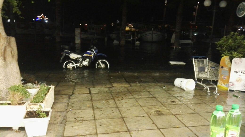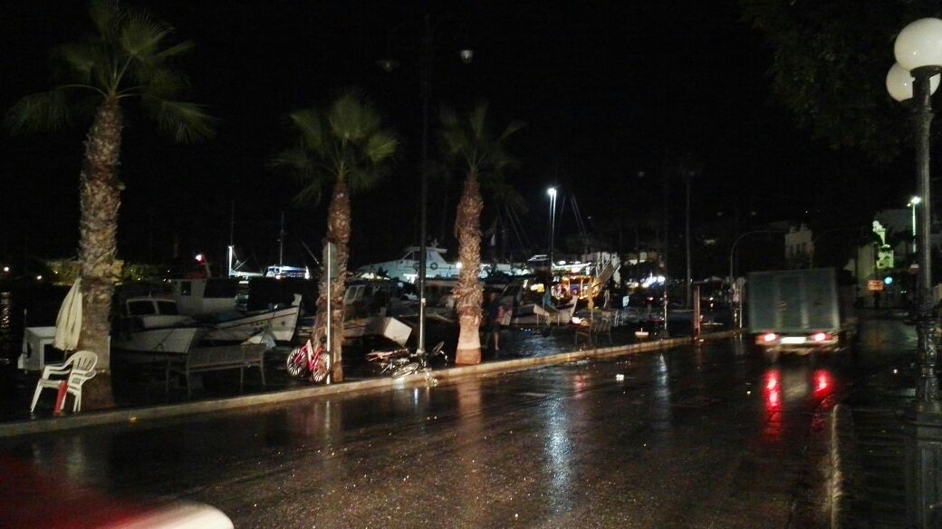 H θάλασσα έχει φουσκώσει κι έχει πλυμμηρίσει την προκυμαία του λιμανιού, ενώ εκτός από υλικές ζημιές σε μαγαζιά και αυτοκίνητα, έχουν καταρρεύσει και κτίρια.