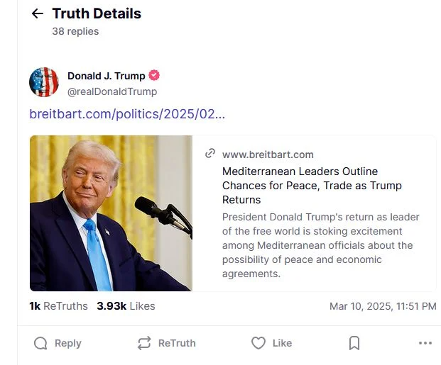 Ο πρόεδρος των Ηνωμένων Πολιτειών Ντόναλντ Τραμπ μοιράστηκε άρθρο της ιστοσελίδας Breitbart News στο οποίο γίνεται ξεκάθαρη αναφορά στον κομβικό ρόλο που παίζουν η Ελλάδα και η Κύπρος στο να ενώσουν απομακρυσμένες περιοχές όπως η Ινδία με την Ευρώπη (σ.σ. ο λεγόμενος διάσδρομος IMEC -India, Middle East, Europe Economic Corridor).