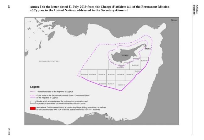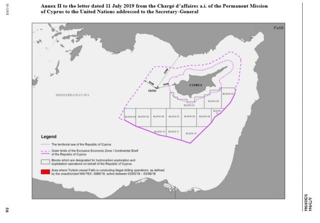 Κατόπιν οδηγιών της κυβέρνησής μου, και κατόπιν των επιστολών μου της 12ης Δεκεμβρίου 2018 (A/73/651) και της 19ης Φεβρουαρίου 2019 (A/73/753-S/2019/160) σχετικά με τις παράνομες δραστηριότητες εξερεύνησης υδρογονανθράκων που διεξήγαγε η Τουρκική Δημοκρατία στην υφαλοκρηπίδα και της αποκλειστικής οικονομικής ζώνης (ΑΟΖ) της Κύπρου, και ειδικότερα, κατόπιν της επιστολής της 2ας Μαΐου 2019 από τον Πρόεδρο της Κυπριακής Δημοκρατίας που απευθύνονταν στο πρόσωπο σας, είμαι υποχρεωμένη να σας πληροφορήσω για τις τελευταίες εξελίξεις όσον αφορά τη συνεχιζόμενη πρόκληση της Τουρκίας και παράνομες ενέργειες κατά της Κυπριακής Δημοκρατίας.