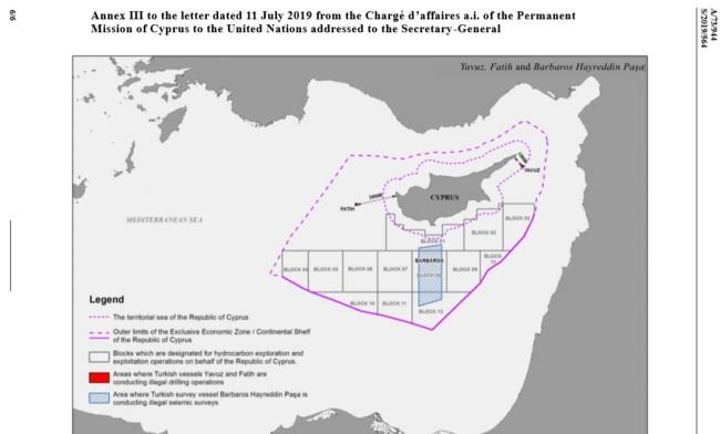 Η Επιστολή προς τον Γ.Γ. του ΟΗΕ και το ΣΑ του ΟΗΕ, η οποία δημοσιεύθηκε χθες ως επίσημο έγγραφο των Ηνωμένων Εθνών αποτυπώνει και καταγράφει όλο το πλαίσιο των παράνομων τουρκικών ενεργειών στην Κυπριακή υφαλοκρηπίδα/ΑΟΖ και χωρικά ύδατα και αποδομεί την τουρκική επιχειρηματολογία περί δήθεν προστασίας των δικαιωμάτων των Τουρκοκυπρίων.