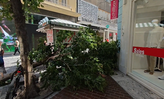 Λόγω των εξαιρετικά ισχυρών ανέμων, ένα μεγάλο δέντρο που βρίσκεται στη συμβολή της Ερμού με την Ευαγγελιστρίας έσπασε και έπεσε στο έδαφος. Όπως φαίνεται στο βίντεο του Orange Press Agency το δέντρο «προσγειώθηκε» δίπλα σε κουλουρά που βρίσκεται στο σημείο, ενώ από τον δρόμο εκείνη την ώρα περνούσε και μια τουρίστρια που τρόμαξε και απομακρύνθηκε ταχέως.