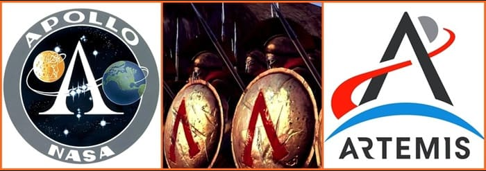 Συγκρίνοντας τώρα τα λογότυπα των δύο διαστημικών προγραμμάτων, «Απόλλων» και «Άρτεμις», βλέπουμε ότι παραμένει ως βασικό σύμβολο αυτών το λάμδα (Λ) που με καλλιτεχνική διάθεση θέλουν να μας το παρουσιάσουν ως άλφα (Α), που είναι το αρχικό γράμμα των λέξεων Απόλλων και Άρτεμις. Το λάμδα, μαζί με το έψιλον, είναι τα βασικά γράμματα των Ελλήνων. Από «Λ» προήλθε το “L”. Ελ! Το «Λ» υπήρχε στις ασπίδες των Λακεδαιμονίων (όχι των Σπαρτιατών) ως καθαρών Ελλήνων. Εξ άλλου ο Απόλλων είναι τιμωρός των Θηβαίων, όπως και ο Μέγας Αλέξανδρος, διότι πολύ απλά οι Θηβαίοι δεν ήταν Έλληνες και ως γνωστόν πάντοτε συμμαχούσαν με τους Σπαρτιάτες. Άρα; Την Ιστορία μας δεν μας την διδάσκουν μόνον λάθος, αλλά και μας παρουσιάζουν το άσπρο, μαύρο. Οι εδώ Θηβαίοι μετοίκησαν από την Θήβα της Αιγύπτου και ξέρουμε ποιοι ζούσαν εκεί από τα… Θρησκευτικά.