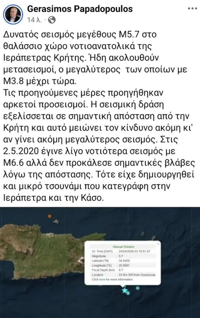 «Δυνατός σεισμός μεγέθους Μ5.7 στο θαλάσσιο χώρο νοτιοανατολικά της Ιεράπετρας Κρήτης. Ήδη ακολουθούν μετασεισμοί, ο μεγαλύτερος των οποίων με Μ3.8 μέχρι τώρα. Τις προηγούμενες μέρες προηγήθηκαν αρκετοί προσεισμοί. Η σεισμική δράση εξελίσσεται σε σημαντική απόσταση από την Κρήτη και αυτό μειώνει τον κίνδυνο ακόμη κι’ αν γίνει ακόμη μεγαλύτερος σεισμός. Στις 2.5.2020 έγινε λίγο νοτιότερα σεισμός με Μ6.6 αλλά δεν προκάλεσε σημαντικές βλάβες λόγω της απόστασης. Τότε είχε δημιουργηθεί και μικρό τσουνάμι που κατεγράφη στην Ιεράπετρα και την Κάσο.»