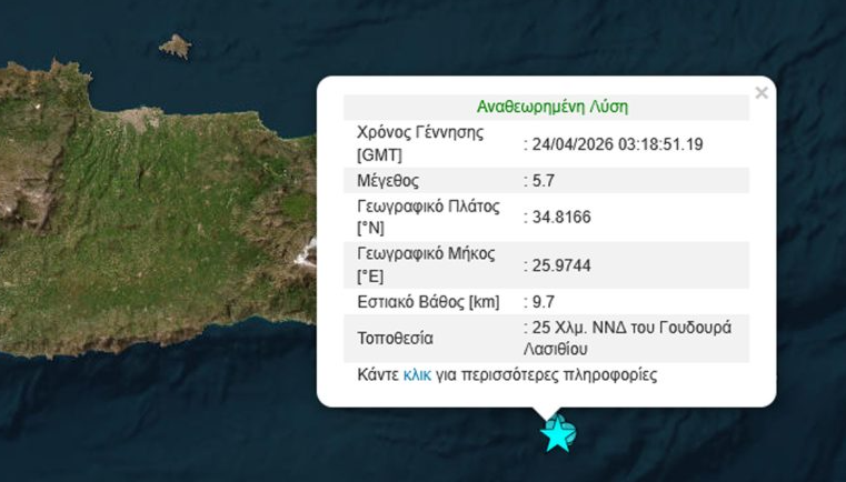 Ισχυρός σεισμός 5,7 Ρίχτερ νότια του Γουδουρά Λασιθίου