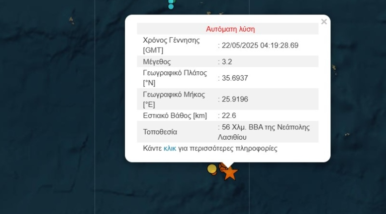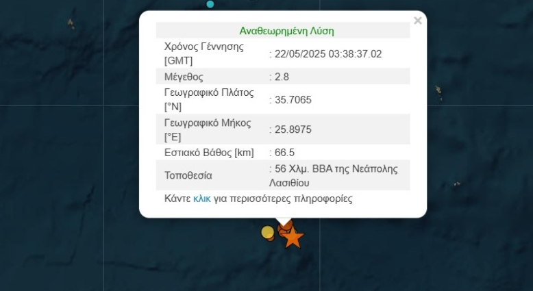 Σύμφωνα με το Γεωδυναμικό Ινστιτούτο, το επίκεντρο του σεισμού εντοπίζεται 56 χιλιόμετρα βόρεια-βορειοανατολικά της Νεάπολης Λασιθίου ενώ το εστιακό βάθος υπολογίζεται στα 60,3 χιλιόμετρα.