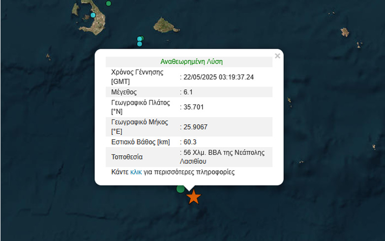 Ισχυρός σεισμός μεγέθους 6,1 βαθμών της κλίμακας Ρίχτερ σημειώθηκε στις 06.19 τα ξημερώματα της Πέμπτης σε θαλάσσια περιοχή ανοιχτά της Κρήτης.