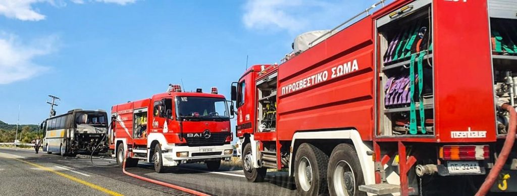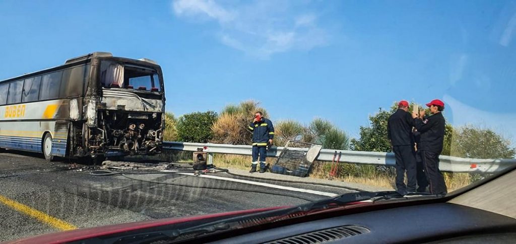 Ένα τουριστικό λεωφορείο με ξένες πινακίδες τυλίχτηκε στις φλόγες όταν η μηχανή του, στο πίσω μέρος του αμαξώματος, πήρε -για άγνωστη μέχρι στιγμής αιτία- φωτιά.