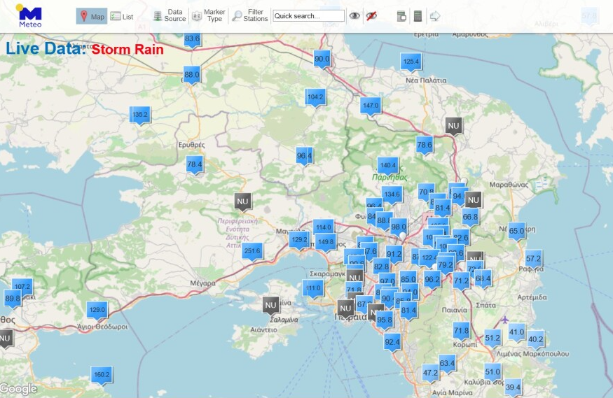 Στη Νέα Πέραμο από χθες έχουν σημειωθεί πάνω από 250 mm βροχής στον σταθμό που βρίσκεται στη Βλυχάδα, επί της Ολυμπίας Οδού