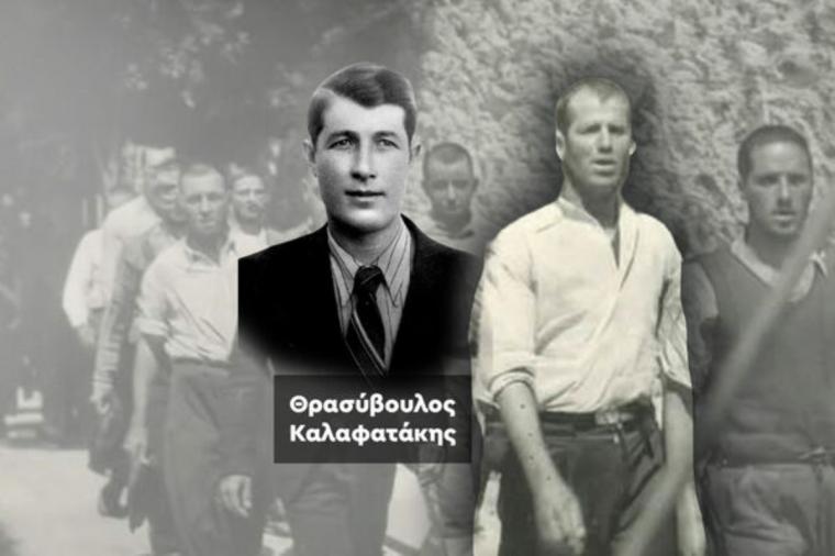 30 χρονών. Ο Θρασύβουλος Καλαφατάκης του Γρηγόρη και της Πελαγίας, γεννήθηκε το 1914 στον Πλατανιά Χανίων της Κρήτης, από εύπορη και πολυμελή οικογένεια. Ήταν ψηλός, εύσωμος, αρρενωπός και χειροδύναμος. Επαγγελματικά ασχολήθηκε με την γεωργία και τη γαλακτοκομία. Παντρεύτηκε πολύ μικρός την Αικατερίνη Χάλη και απέκτησαν δύο κόρες, τη Μαρία και την Ιφιγένεια.