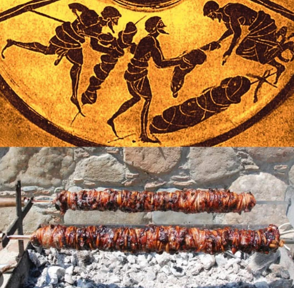 Ψήσιμο “Πλεκτής” (κοκορέτσι), απεικονίζεται σε λεκανίδιο του 500 π.Χ που βρέθηκε στη Βοιωτία.