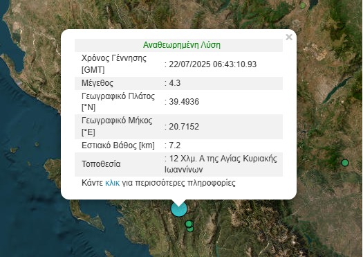 Σεισμός εντάσεως 4,3 Ρίχτερ σημειώθηκε στις 09:43 το πρωί της Τρίτης (22/07) στα Ιωάννινα