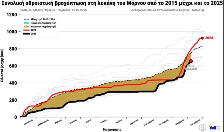 Συγκεκριμένα, στον σταθμό του Κονιάκου έχουν καταγραφεί 595 χιλιοστά βροχής, ενώ στο Φράγμα Μόρνου το συνολικό ύψος ανέρχεται σε 653 χιλιοστά, όταν η μέση τιμή της τελευταίας δεκαετίας για την ίδια περίοδο φτάνει περίπου τα 800 χιλιοστά.