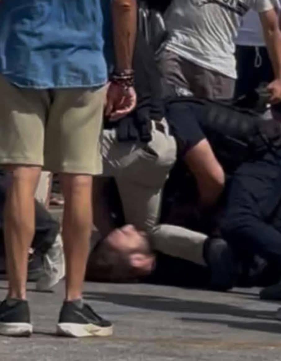 Στην τρίτη φωτογραφία βλέπουμε τον ένα πράκτορα της μοσάντ να πατάει με το γόνατο το λάρυγγα Έλληνα διαδηλωτή ο οποίος συνελήφθη από τον Ισραηλινό πράκτορα σε Ελληνικό έδαφος και υπάρχει μεγάλη πιθανότητα να αντιμετωπίσει σοβαρές κατηγορίες