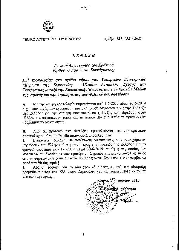 ΜΕ ΤΡΟΠΟΛΟΓΙΑ ΠΟΥ ΦΕΡΑΝΕ ΝΥΧΤΑ ΣΤΗ ΒΟΥΛΗ ΣΕ ΝΟΜΟΣΧΕΔΙΟ ΤΟΥ ΥΠΟΥΡΓΕΙΟΥ ΕΞΩΤΕΡΙΚΩΝ ΠΟΥ ΑΦΟΡΟΥΣΕ ΤΗΝ ΕΠΙΚΥΡΩΣΗ ΣΥΜΦΩΝΙΑΣ ΕΤΑΙΡΙΚΩΝ ΣΧΕΣΕΩΝ ΜΕ ΤΙΣ ΦΙΛΙΠΠΙΝΕΣ ΔΩΣΑΝΕ ΠΑΡΑΤΑΣΗ ΠΑΡΟΧΗΣ ΕΓΓΥΗΣΕΩΝ ΤΟΥ ΕΛΛΗΝΙΚΟΥ ΔΗΜΟΣΙΟΥ ΕΝΑΝΤΙ ΤΗΣ ΤΡΑΠΕΖΙΚΗΣ ΣΥΜΜΟΡΙΑΣ ΜΕΧΡΙ ΤΟ 2019…Η ΕΠΙΒΑΡΥΝΣΗ ΣΕ ΠΕΡΙΠΤΩΣΗ ΠΟΥ ΣΚΑΣΟΥΝ ΟΙ ΤΡΑΠΕΖΕΣ ΘΑ ΦΤΑΣΕΙ ΤΟ ΠΟΣΟ ΤΩΝ 90 ΔΙΣ ΕΥΡΩ ΚΑΙ ΘΑ ΤΑ ΠΛΗΡΩΣΕΙ Ο ΣΥΝΗΘΗΣ ΥΠΟΠΤΟΣ Μ@Λ@ΚΑΣ ΕΛΛΗΝΑΣ ΦΟΡΟΛΟΓΟΥΜΕΝΟΣ ΜΕ ΤΑ ΜΝΗΜΟΝΙΑ ΤΟΥΣ….H ΑΡΙΣΤΕΡΗ ΣΥΜΜΟΡΙΑ ΠΑΡΕΧΕΙ ΕΓΓΥΗΣΕΙΣ ΣΤΑ ΜΑΓΑΖΙΑ ΤΟΥ WATSA KAI TOY PAULSON..ΘΑΥΜΑΣΤΕ ΠΟΛΙΤΙΚΗ ΑΛΗΤΕΙΑ