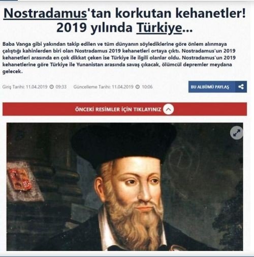 Ποτέ ο τουρκικός Τύπος δεν δημοσιεύει κάτι που να αφορά τα ελληνοτουρκικά χωρίς να ακολουθάει την γραμμή των αποφάσεων του τουρκικού Συμβουλίου Εθνικής Ασφάλειας και έτσι η τουρκική εφημερίδα Sabah δημοσίευσε στην ιστοσελίδα της άρθρο που λέει ότι ο Νοστράδαμος προέβλεψε πόλεμο μεταξύ Ελλάδας και Τουρκίας το 2019, ενώ για την ίδια χρονιά είχε προφητεύσει και μεγάλο, θανατηφόρο σεισμό σττην Τουρκία.
