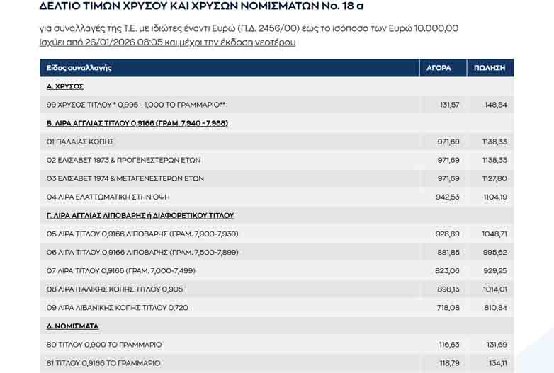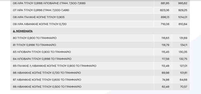 Παρακάτω το δελτίο τιμών χρυσού και χρυσών νομισμάτων από την Τράπεζα Ελλάδος:
