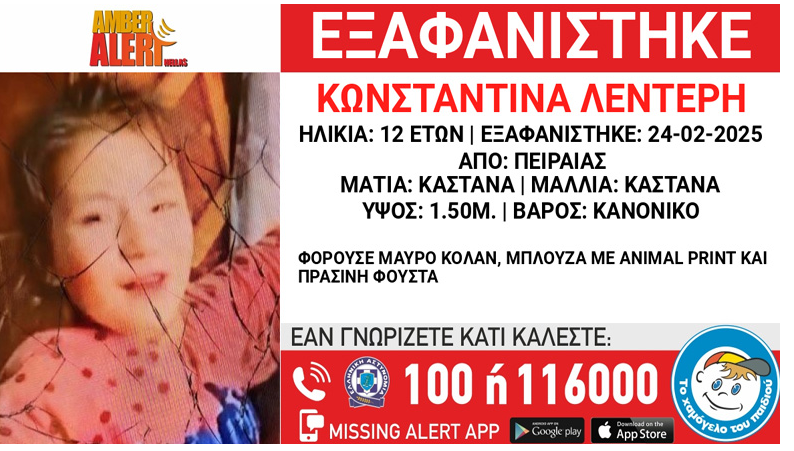 Στις 24.02.2025, απογευματινές ώρες, εξαφανίστηκε από την περιοχή του Πειραιά, η Κωνσταντίνα Λέντερη , 12 ετών. «Το Χαμόγελο του Παιδιού» ενημερώθηκε για την εξαφάνιση της ανήλικης σήμερα, 05.03.2025 και προχώρησε άμεσα στην ενεργοποίηση του μηχανισμού AMBER ALERT HELLAS, κατόπιν εισαγγελικής εντολής.