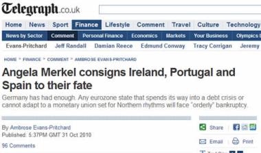 Σε περίπτωση εφαρμογής της διαδικασίας ελεγχόμενης χρεοκοπίας στους κόλπους της νομισματικής ένωσης που επεδίωξε και πέτυχε η Γερμανία, όπως επισημαίνεται σε δημοσίευμα της Telegraph, οι κάτοχοι ομολόγων είναι εκείνοι που θα κληθούν να πληρώσουν το τίμημα.Ο αρθρογράφος μάλιστα διερωτάται τι σκέπτονταν οι επενδυτές όταν επέλεγαν να αγοράσουν δεκαετή ομόλογα όταν βρίσκονταν στις 260 μονάδες βάσης σε σχέση με τα γερμανικά ομόλογα το 2007. Θα μπορούσε κανείς να υποστηρίξει, όπως αναφέρεται στο δημοσίευμα, ότι οι κάτοχοι ομολόγων της Ευρωζώνης θα έπρεπε να είχαν τιμωρηθεί πολύ νωρίτερα για τα σφάλματά τους, την αγορά δηλαδή ομολόγων χωρών όπως η Ελλάδα σε τιμές που δεν ανταποκρίνονταν στην πραγματικότητα.