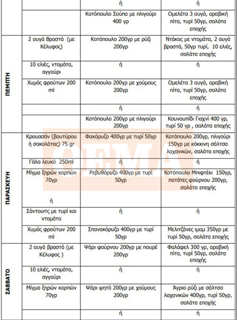 Κάτωθι ακολουθεί ένα τυπικό παράδειγμα μενού σε δομή φιλοξενίας αιτούντων άσυλο που αφορά τον γενικό πληθυσμό, όχι ειδικές ομάδες, όπως ευάλωτοι, βρέφη, ή άλλες των οποίων η διατροφή καθορίζεται από αυστηρά θρησκευτικές πεποιθήσεις ή προβλήματα υγείας, όπως οι διαβητικοί.