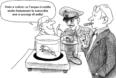 «Ἕνα βατραχάκι κολυμποῦσε ἀμέριμνο σὲ μία χύτρα μὲ δροσερὸ νερό. Οἱ παρατηρητὲς ἀνάψαν μία χαμηλὴ φωτιὰ κάτω ἀπὸ τὴ χύτρα. Ἡ θερμοκρασία τοῦ νεροῦ ἀνέβαινε ἀργὰ ἀλλὰ σταθερὰ 25..26..27….35 βαθμοί. Τὸ βατραχάκι ἔνοιωθε μία μικρὴ διαφορά, ἀλλὰ αἰσθανόταν ἀκόμα σχετικὰ ἄνετα. 40-45, μία μικρὴ δυσφορία, ἀλλὰ τίποτε τὸ ἀνησυχητικὸ δὲν περνοῦσε ἀπὸ τὸ μυαλό του, μόνο που αἰσθανόταν λίγο κουρασμένο. 50 βαθμοὶ καὶ ἡ ἐνόχληση ἦταν πιὰ μεγάλη, ἀλλὰ καὶ ἡ κούραση ἐπίσης· γι’ αὐτὸ καὶ ὑπομένει καὶ δεν ἀντιδρᾶ. Σὲ λίγο ἡ θερμοκρασία κάνει τὸ βατραχάκι νὰ χάσει τις αἰσθήσεις του καὶ σύντομα βράζει μέσα στὴ χύτρα.