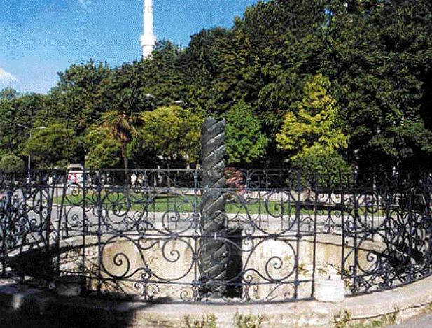Στον βυζαντινό ιππόδρομο της Κωνσταντινούπολης, ο οποίος φυσικά δεν διατηρείται σήμερα στην αρχική του μορφή είχε στήσει ο Μέγας Κωνσταντίνος (κατά την παράδοση) το μνημείο ως συμβολικό θεμέλιο της νέας πόλης. Και εκεί ακριβώς βρίσκεται ακόμη, στην πλατεία Σουλτάν Αχμέτ όπως λέγεται, περιφραγμένο με κάγκελα και ταλαιπωρημένο από τις καιρικές συνθήκες. Απουσιάζουν εξάλλου και τα τρία κεφάλια του φιδιού, τα οποία αποκόπηκαν από τον κορμό του περί το 1700 με αποτέλεσμα να διασώζεται σήμερα μόνον το ένα, στο Μουσείο της Κωνσταντινούπολης. Οσο για το χρυσό άνω μέρος του τρίποδα, αυτό εξαφανίσθηκε πολύ νωρίς, συγκεκριμένα έναν αιώνα μετά από την φιλοτέχνηστή του, όταν το έλιωσαν οι Φωκείς προκειμένου να κόψουν νομίσματα και να χρηματοδοτήσουν τον πόλεμό τους.