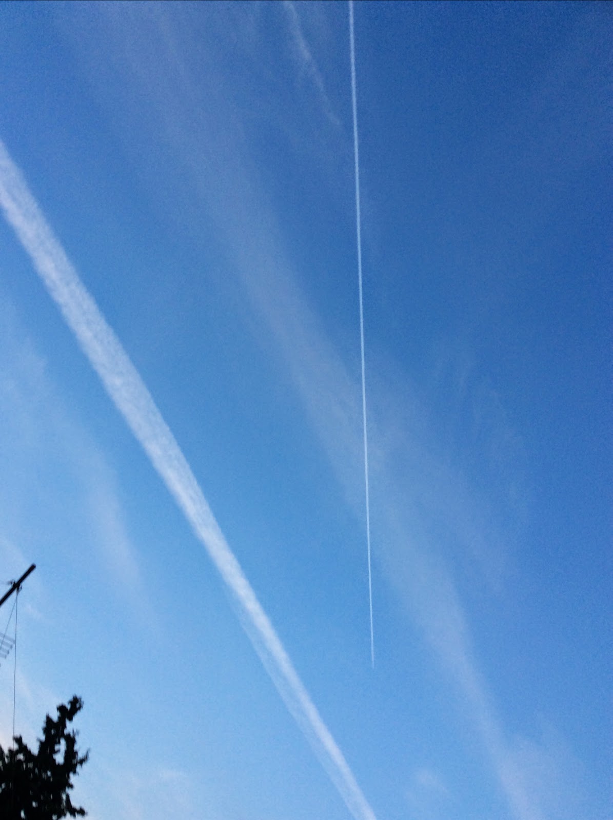 Και συνεχίζω τις ερωτήσεις με το γιατί σήμερα το πρωί 22/3/2015 είχαμε αυτά τα αραχνοΰφαντα σύννεφα, που δεν έκρυβαν όμως τα τεράστια αεροπλάνα που τώρα κατευθύνονταν από ΒΔ προς ΝΑ, παράλληλα το ένα από το άλλο και αφήνοντας από πίσω τους τη χαρακτηριστική γραμμή του ψεκασμού ακόμη και στις 11:30 που η θερμοκρασία ήταν 12 οC ;